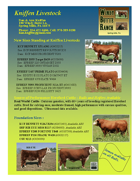 Windy Butte Ranch is located in Central Pennsylvania in Centre County. We pride ourselves in producing quality and not quantity, as both of us were faculty members at Penn State University, we need cattle that will maintain themselves on minimal input. We have no tolerance for cattle that require excessive maintenance or time, this in turn has driven us to cull heavily and to only pass these hardy genetics on to you. We are dedicated to the Hereford industry and can't wait to see how our genetics will influence the breed in the years to come.